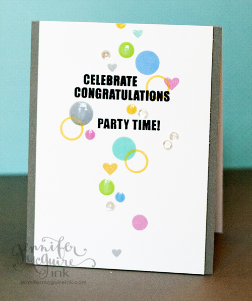 And here is a secret: I love tiny stamp images that can be used to scattered along a card. They are so versatile - they can be used for just accents or to build an entire card as I did here. And the Sunny Skies set? It has the perfect small circles and hearts for just this. Yay! These little images are perfect around the Soiree greetings.