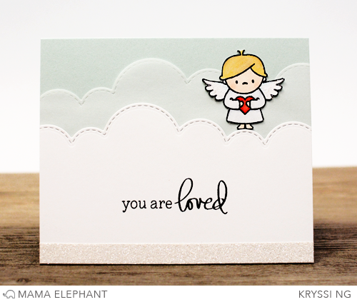 My second card uses the cloud border die from Landscape Trio Creative Cuts, one layer with plain white cardstock and the second with vellum. My angel was stamped and cut out and perched atop one of the clouds.