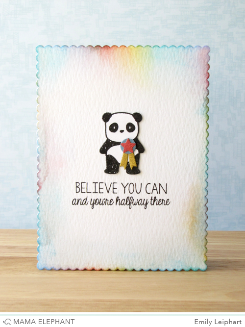 Emily created a watercolored frame to highlight the encouraging sentiment from True Friend with an award-winning panda. His medallion was made with Confetti Creative Cuts as well as the Dainty Bow.