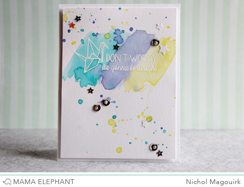 Nichol stamped greetings from True Friend and a bird image from Origami on watercolor cardstock using Versamark ink. She embossed the images with white embossing powder and applied a watercolor wash over the embossed images creating a soft and pretty watercolor resist image.