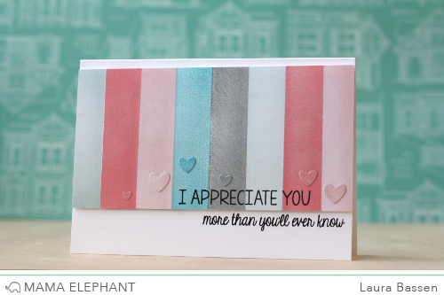 Laura used the thick solid stripe and some Mama Elephant inks to create the colorful background pattern. She also added some die cut hearts that were inked to match the stripes.