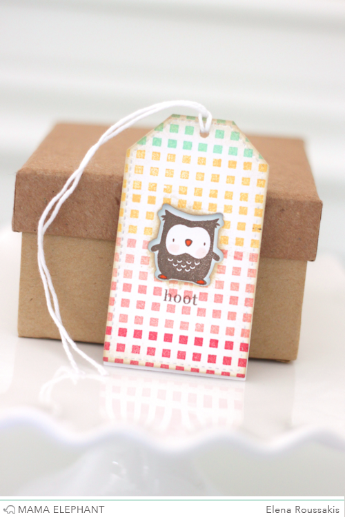 Elena's tag is a "hoot!" It packs a punch, with the rainbow-stamped "on point" squares, and the adorable "just hatched" owl, tucked into the