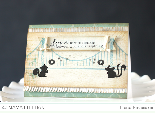 The little critters from tree friends look extra cute in front of the bridge! Elena grounded her images with the sentiment banner up top, stamping the bridge onto the banner as well as the panel underneath.