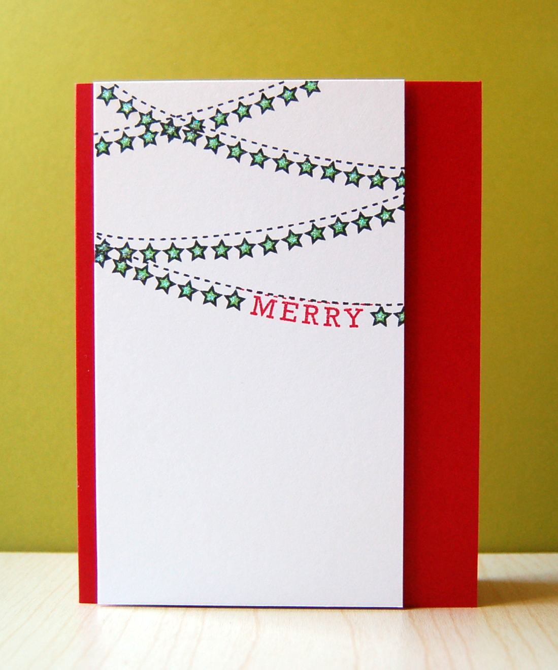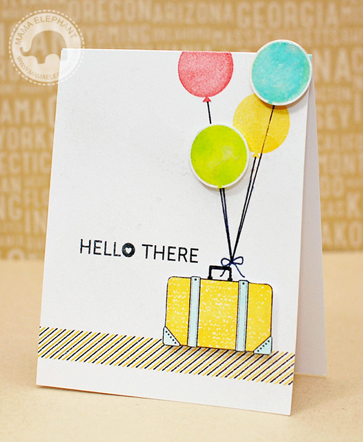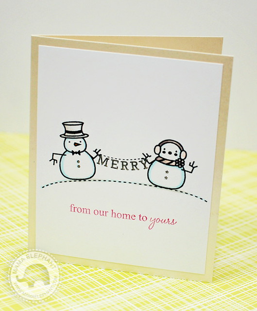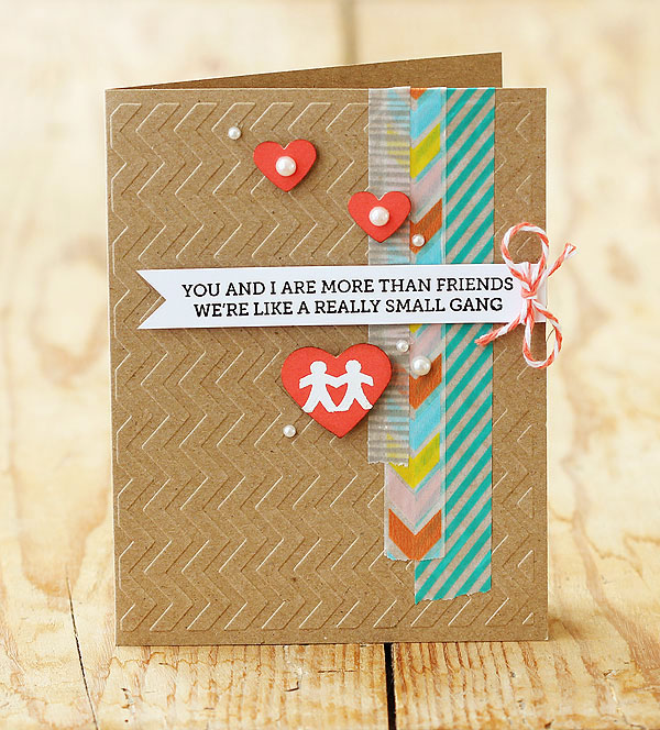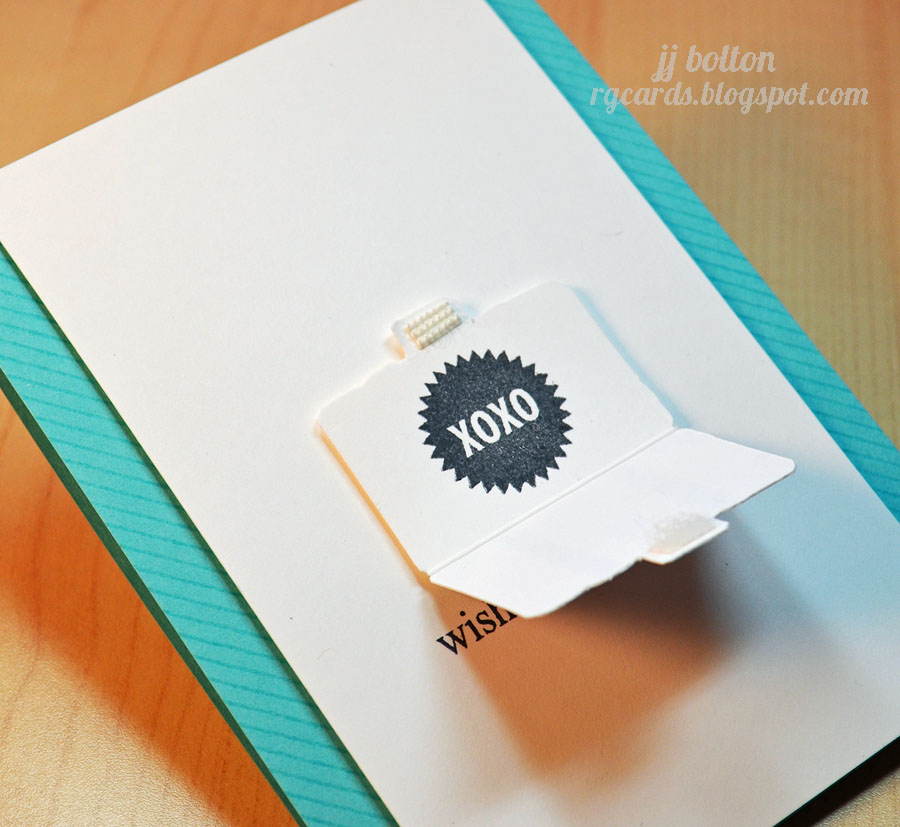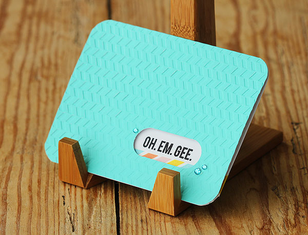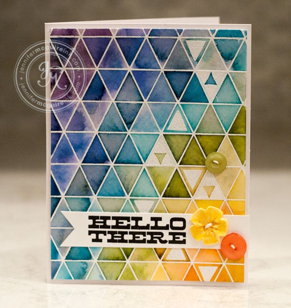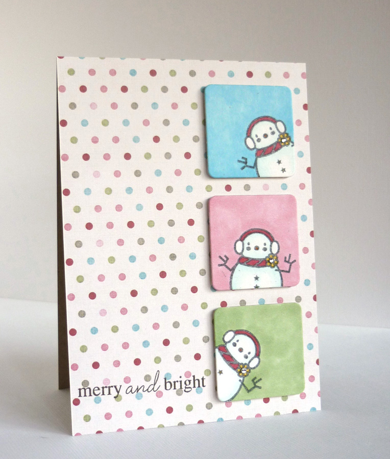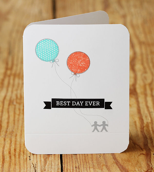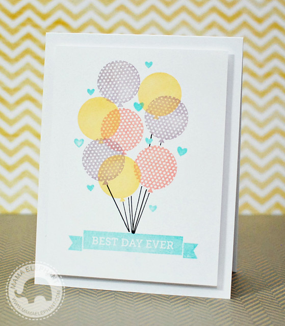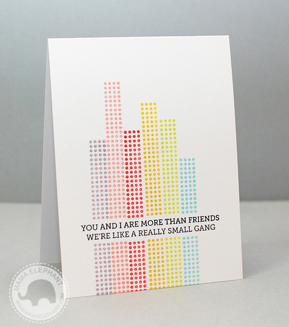 I first masked off a horizontal strip to stamp my sentiment in later. Then I went about stamping the dot border in different colors. After I got my rainbow of varying heights done, I simply peeled off my masking tape and went back and stamped my sentiment from Good Times. (Gosh, I love that sentiment!)