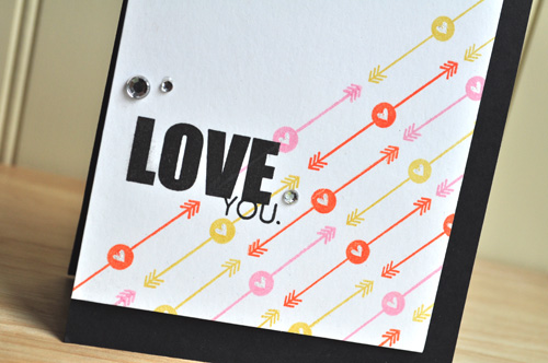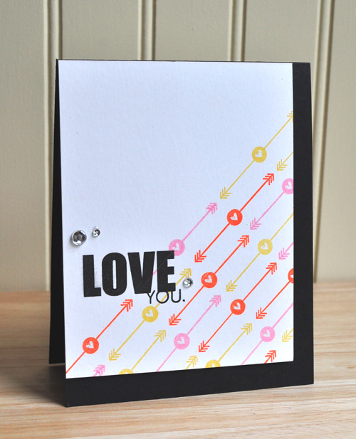 For my next card using the set, I took the arrow image, and stamped it repeatedly on the diagonal. I then stamped my sentiment and adhered a few gems, placing it onto a black card base.