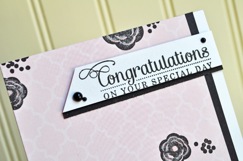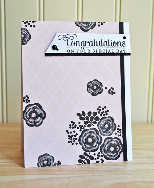 For my last card, I decided to do a little stamping on patterned paper. I took a piece of Echo Park paper, and stamped the blooms randomly onto it. I then attached a black cardstock strip and adhered the whole piece to a white card base. I then stamped my sentiment onto a white strip of cardstock, trimmed it down and adhered it with foam. As a last addition, I added a bit of glitter to my floral images.