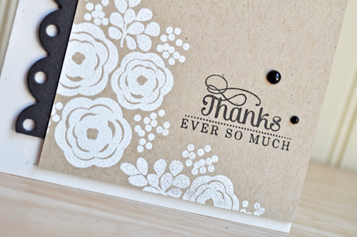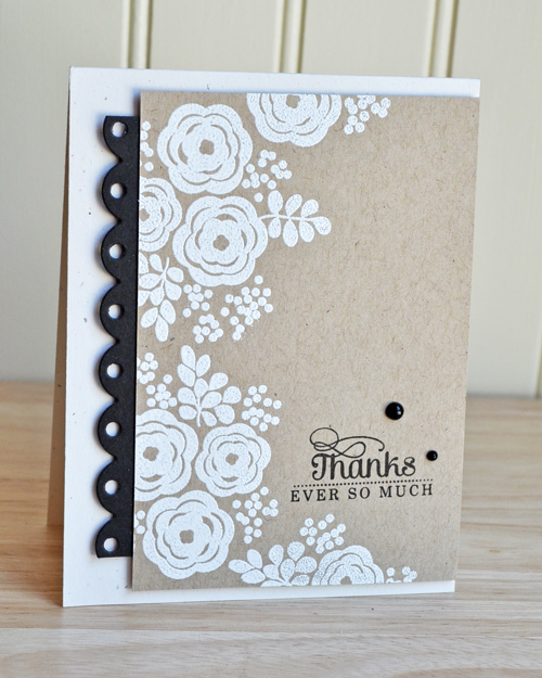 The last set, Water Blooms, is one of my favorites from this release. I am a sucker for florals! I began by stamping the large cluster with Versamark ink onto a Kraft panel. I then heat embossed it with white powder, adhered a section of scalloped border to the side and then to my card base with foam.