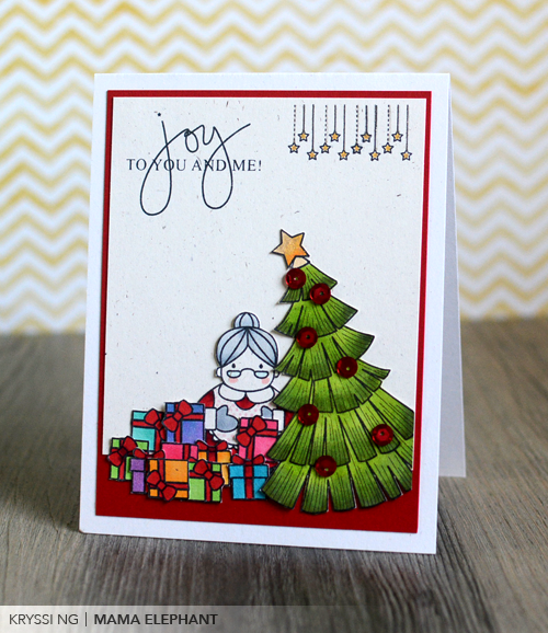 My next card I went a little nuts... by my standards at least! I stamped, colored and paper pieced every single thing you see here. Except the stars on the top and the sentiment. But yeah, all of everything else. Don't ask me how long it took and how many grey hairs I've grown since. Mrs. Claus sure has her hands full with gifts and a tree that's about to topple over, lol.