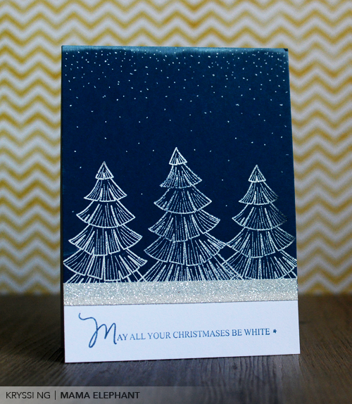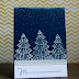 I couldn't put my white pen down so I decided to create another snowy scene using the same tree. This time, it's set at night. I stamped the trees with Versamark and heat embossed it with white embossing powder. I swiped some white ink on the top edge of the card. Then instead of drawing the snow in, I dotted it so it's smaller. It has a different feel from the first card this way. The sentiment is from Merry Greetings.