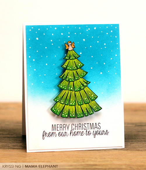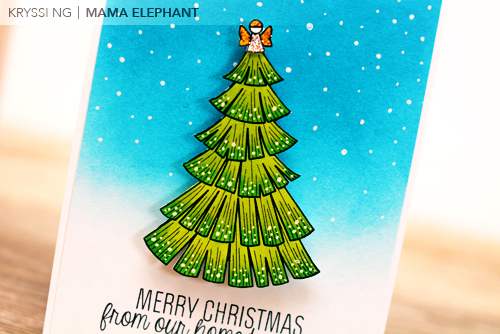 I've decided to feature both sets together today because they go great together! The first card features the main tree. I chose to use the angel tree topper (one of 3 different tree toppings!) and added Stickles to make it shine. I colored the tree in with Copic markers, cut it out and set aside. I created the gradient backdrop with distress inks. Using our new white gel pens, I went to town drawing in snow. Snow, snow, so much snow!
