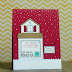 Using the same colors, I created this next card stacking the bottom building on top of one another to create a 2 story building. It looks like a cute little boutique. I stamped the sentiment in white ink over a dark grey cardstock, cut it out and adhered on top. I also cut a tiny strip of the scarlet cardstock to give it some balance.