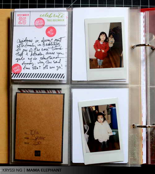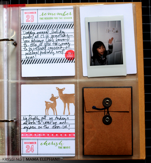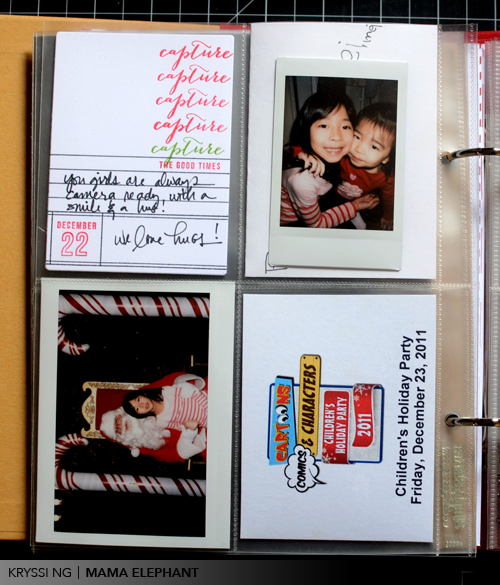 I dug into my 2011 December pictures that I still haven't filed away. I had a cool advent pocket calendar system that year and it's still hanging on my door. Yup, almost 2 years untouched. Until now, lol! I created 4 simple 3x4 journaling cards to fit into my Snap album. The stamps work flawlessy with the 3x4 dimensions.