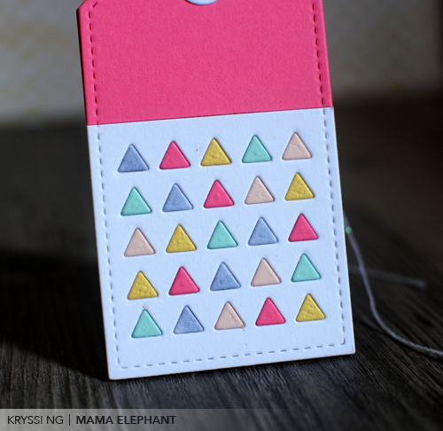 Here's the first tag I couldn't wait to try. Can I just call this eye candy? Isn't it really? I die cut the main tag and then die cut the mini triangles directly on top of the tag. I did this 5 times to create this seamless pattern. Then I die cut the triangles 5 times on colored cardstock and used the positives on top of the negative space. It has a flushed look this way, so neat and tidy!