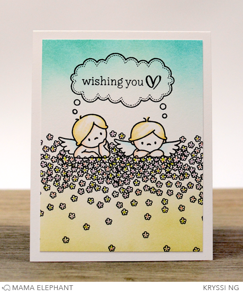 Here are two angels on a bed of flowers, just so light and airy... wishing you love. I used distress ink to color the top and bottom of the card to represent the sky and ground. The flowers and angels were lightly colored with Copic markers to maintain that light, floaty feeling.