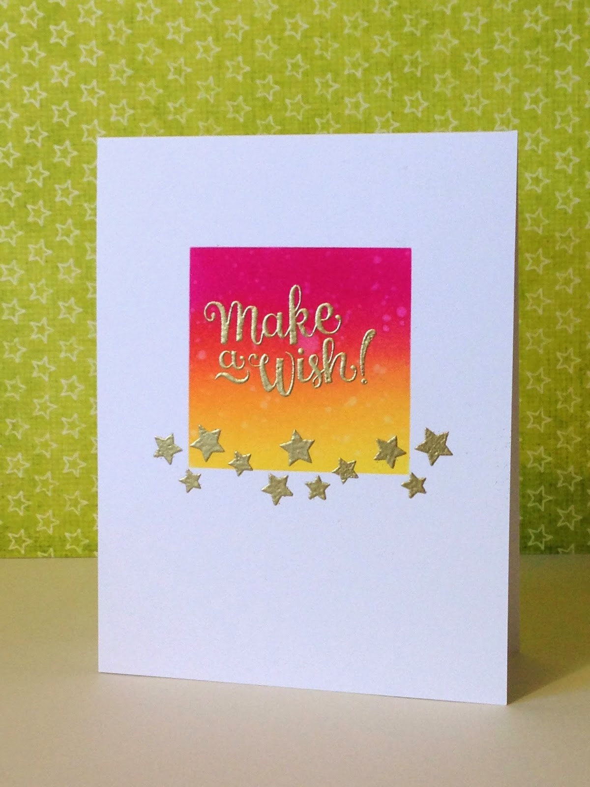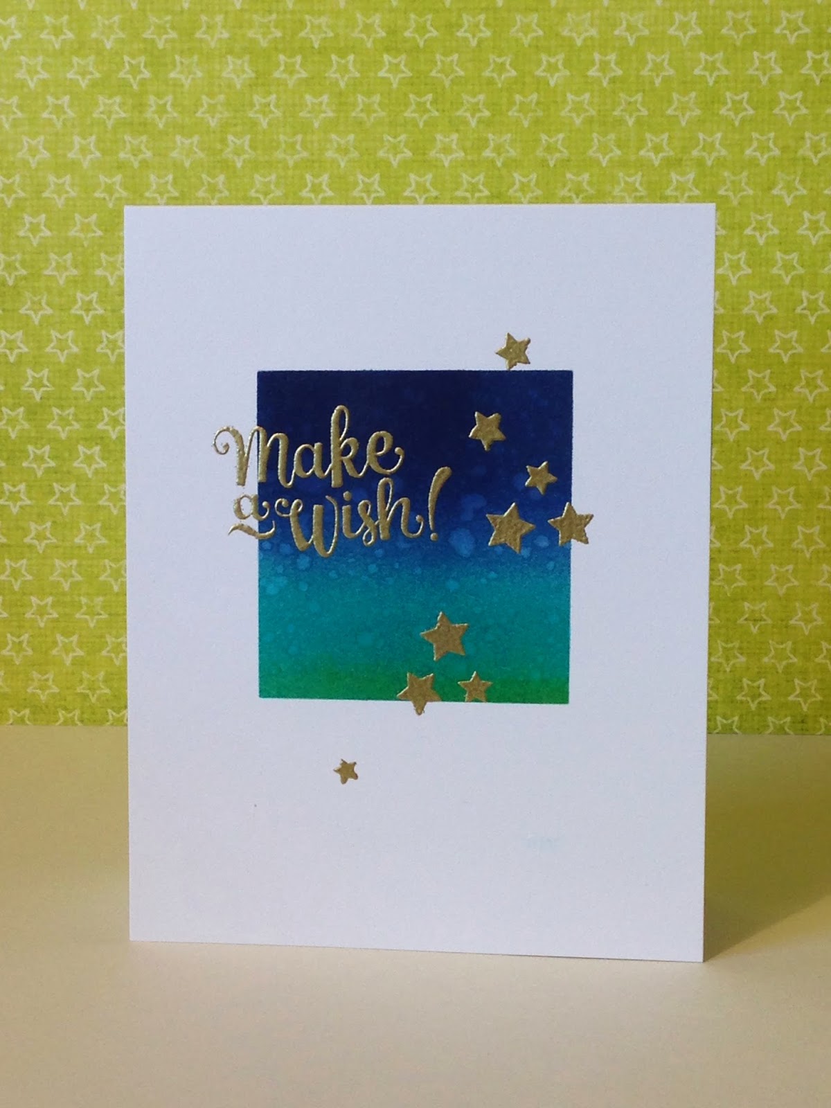 Hello! Today I’m sharing some cards using Make a Wish, my favorite set from the new release. Using Post-It Tape, I masked off a square area on the front of the card, and ink distressed several colors of Distress inks inside the square. I also flicked some water, and dried the inked area thoroughly with a heat tool.