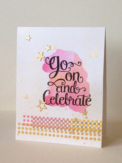 Donna was going for washi tape look with small square border. She stamped in Delicata Gold and then with two colors of mid tone inks. She then watercolored a small portion of the card behind the sentiment. Last but not least, die cut gold stars were added.