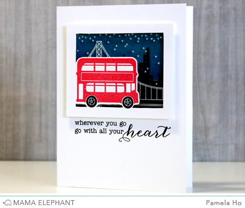 Geralyn created a cute little scene with the double-decker bus and bridge. She added some watercolor detail and handlettered the sentiment to finish the card.