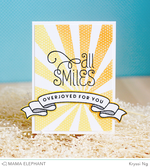 When I create my First Looks projects, I try to stick to one set that I'm focusing on. But I have to tell you that all 4 sets we're releasing this month work so flawlessly together, it's hard to not reach out to them and mash them all together! So, in this mini card today, I'm showing you more of the banner from Bloomsies as well as the awesome large scaled polka dotted sun rays stamp from My Sunshine.