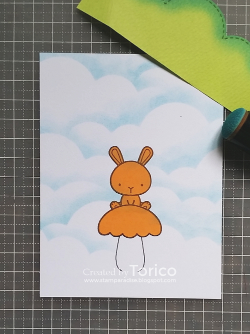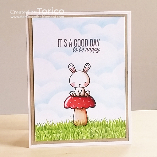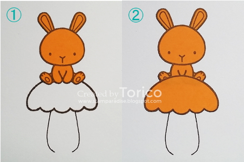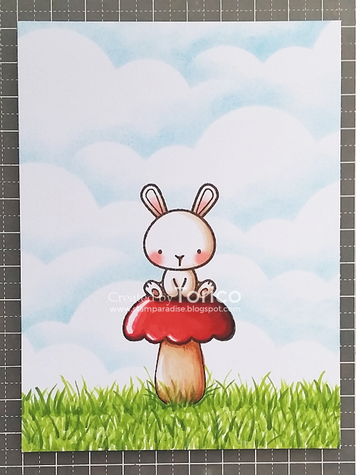 - Stamp a bunny and mask it. Then stamp a mushroom cap (I mean a top part of cupcake) and draw a stem with a gel pen.
