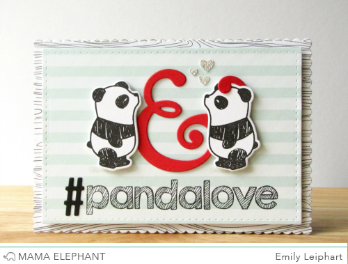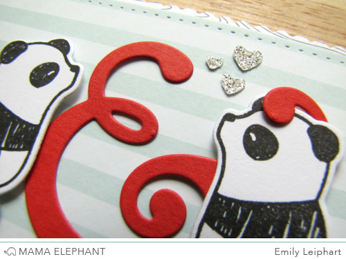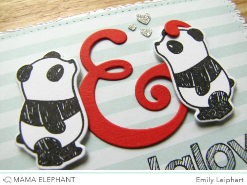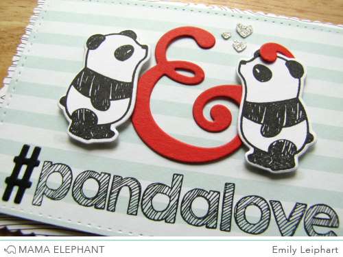 To complement the hashtag, I die cut and stamped the pandas from Pandamonium Creative Cuts and Pandamonium, respectively. The ampersand is adhered to the panel with glue dots and the pandas are popped up with foam tape.