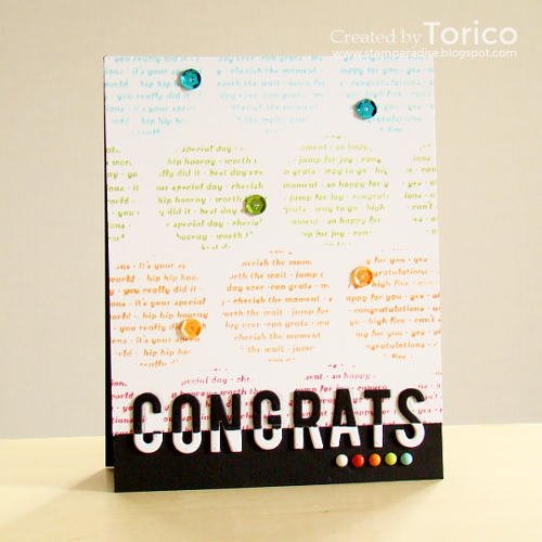 Torico made a mask using a circle die and stamped a sentiment border in four colors to create her own patterned paper.