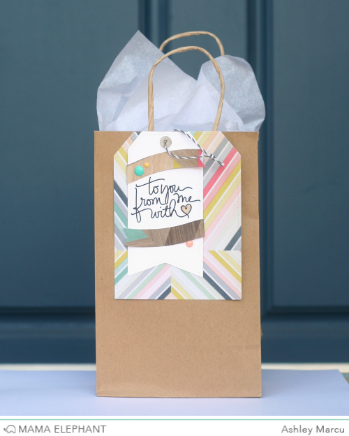 For this project, I dressed up a simple gift bag using three of the dies found in Tags a Lot. First I die cut the largest tag from patterned paper. Next I layered in the medium sized tag and stamped it with one of my all time favorite sentiments from Confetti. To bring attention to the sentiment, I die cut the banner in Tags a Lot twice and wraped it around the medium tag. I chose the simple hole reinforcer die for my tag, also included in the Tags a Lot die set.
